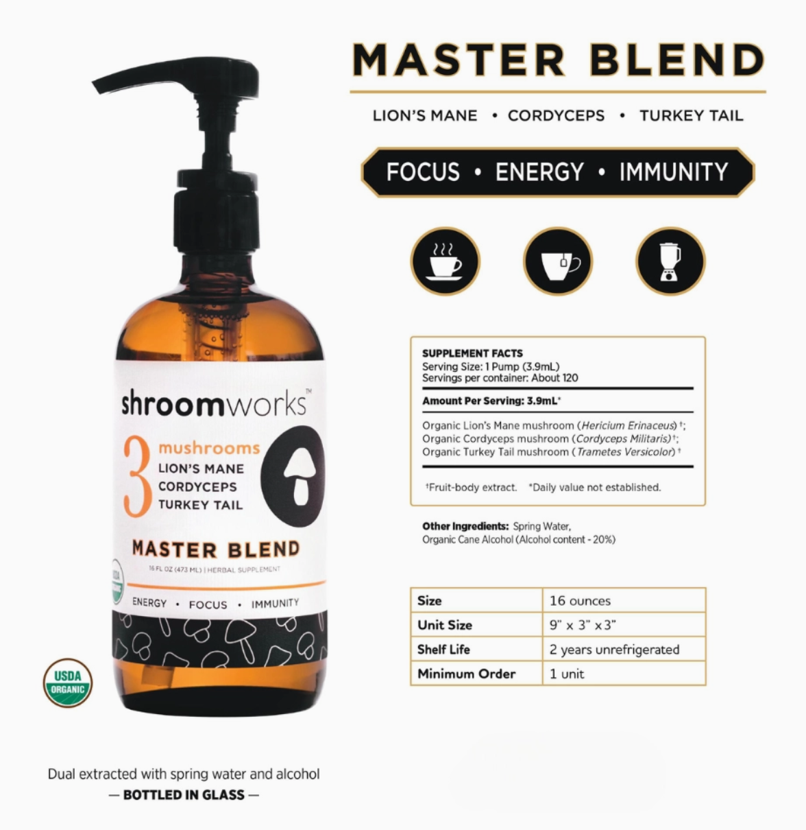 Shroomworks Mushroom Master Blend is a mix of three adaptogenic mushroom extracts (lion's mane, cordyceps, turkey tail) that support all-natural focus, energy and immunity. Conveniently packaged in a barista style pump bottle it can be used to make adaptogenic mushroom coffee or offered as an added boost to any beverage. Upgrading drinks with all-natural focus, energy, and immune support is as simple as one pump (no powders, no mixing, no mess!).
